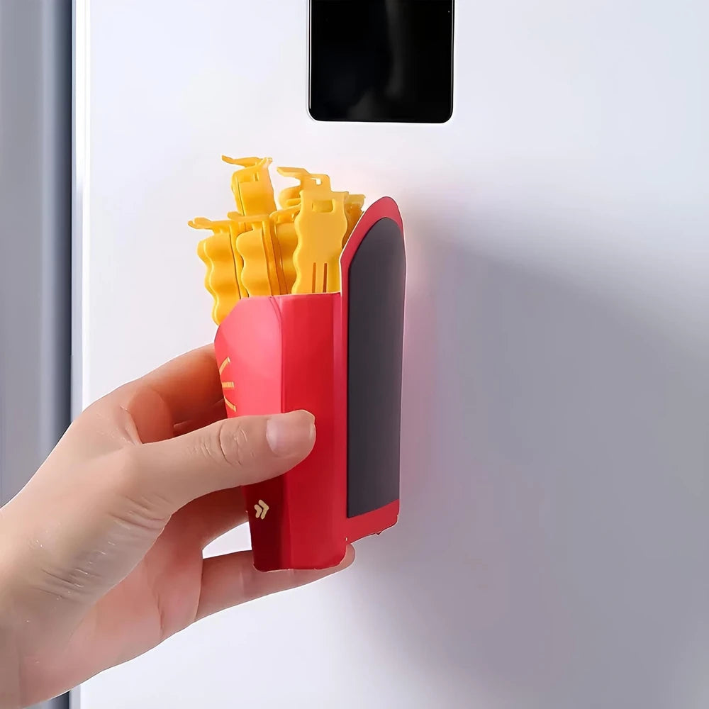 Estos broches cierra bolsa con forma de papa frita son el arma secreta para mantener tus alimentos frescos y protegidos. Con 9cm de largo y 1cm de ancho, cierran bolsas con precisión sin complicaciones. Lo mejor: vienen en un estuche magnético que se adhiere a tu heladera, siempre visible y listo para actuar. Olvídate de alimentos arruinados y desperdicios. Cada clip es fácil de usar y garantiza un cierre hermético que mantiene la frescura intacta. Práctico, ingenioso y absolutamente indispensable en cualquier cocina que se respete.