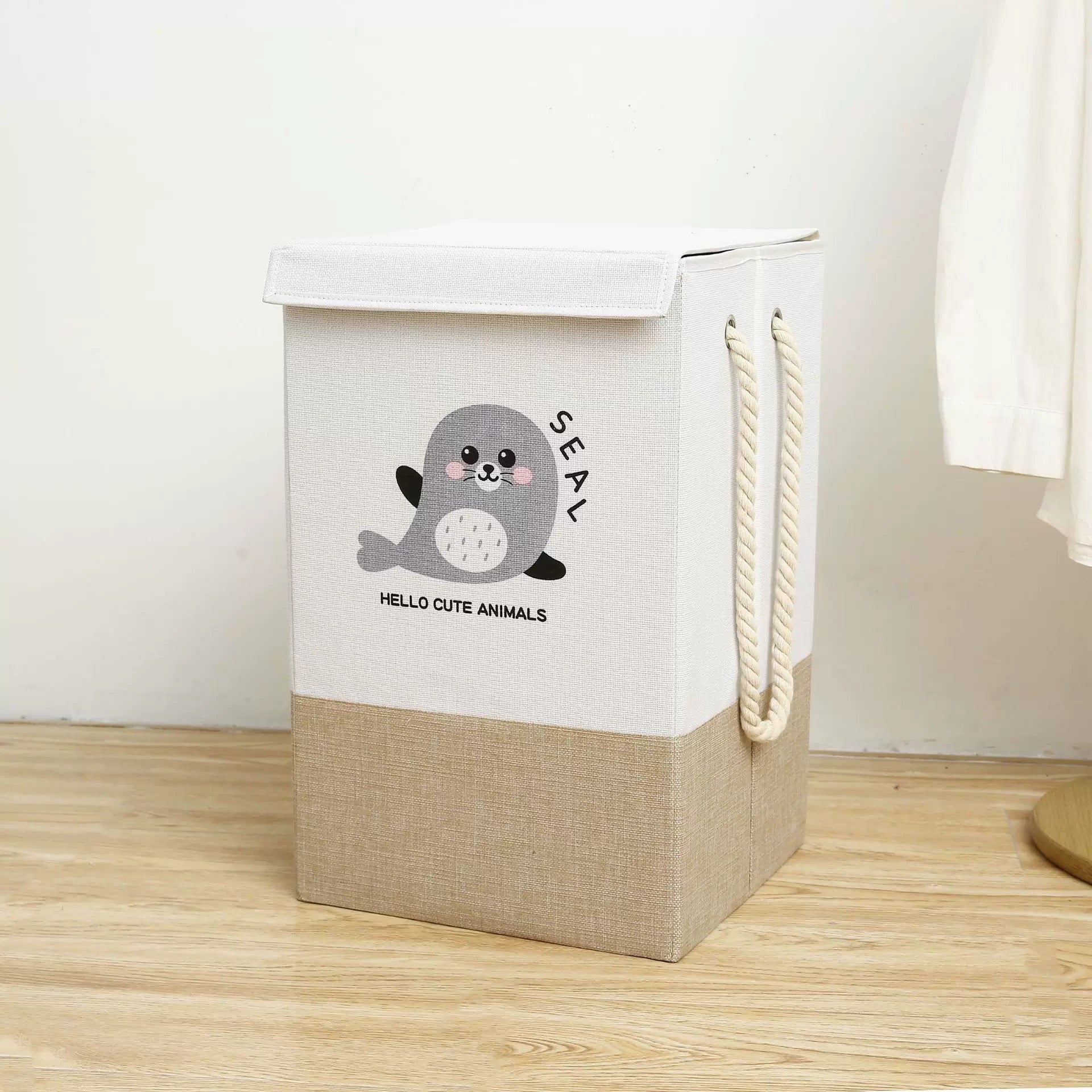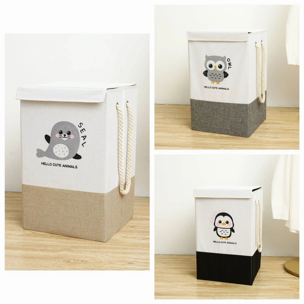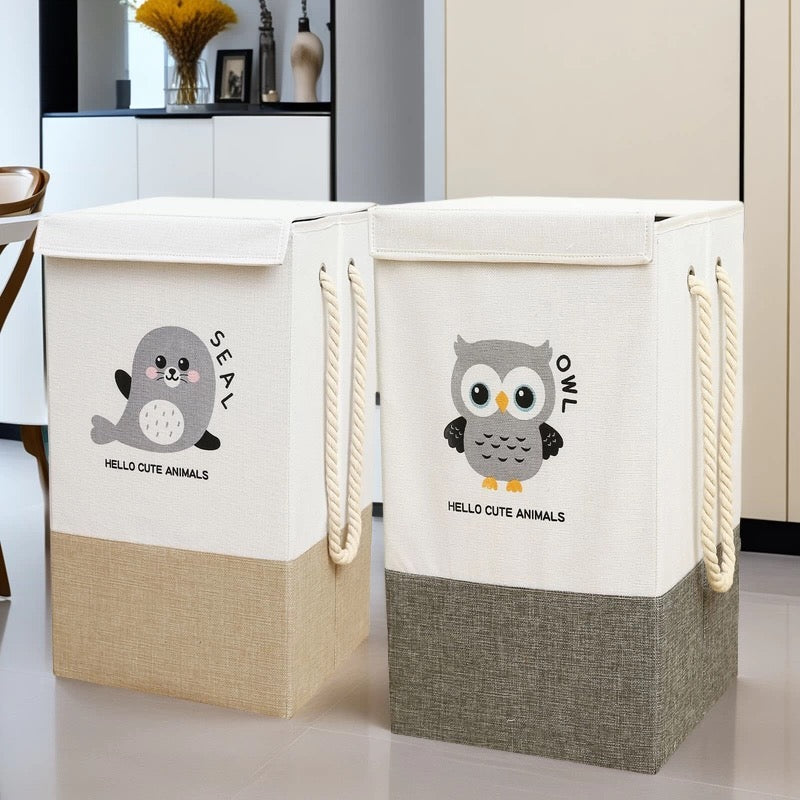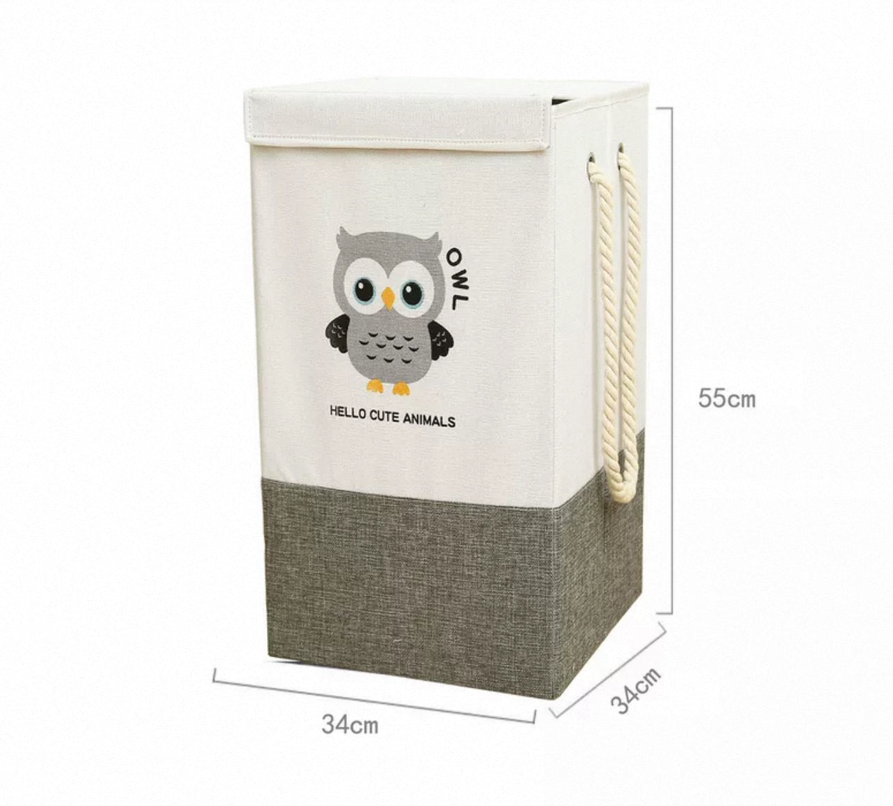 Largo: 34cm x Ancho: 34cm x Alto: 55cm, Cada cesto cuenta con una tapa, dos manijas y un diseño rústico bicolor con un logo en el centro. Ideal para almacenar ropa