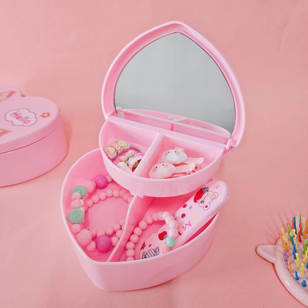 Este divertido Kit Accesorios Infantil en forma de corazón es perfecto para que los más pequeños guarden sus tesoros. La cajita, con espejo y varios compartimentos, incluye un peine, collar, colitas y hebillas, todo pensado para que los niños se diviertan mientras organizan sus accesorios. Un regalo encantador y práctico que encantará a cualquier niña.