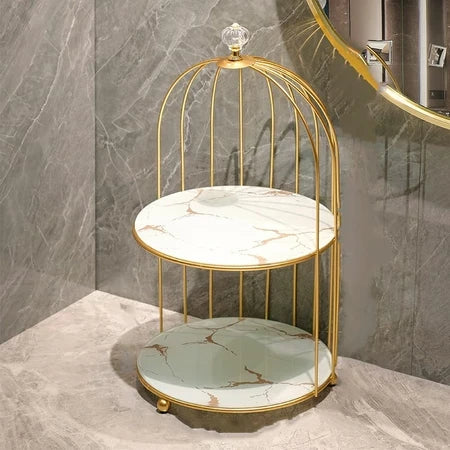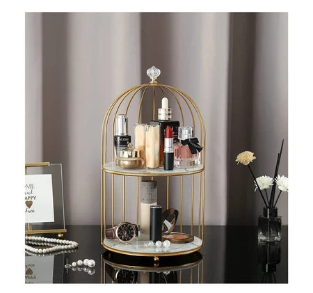 Descubre nuestro Organizador Multiuso de 2 Niveles, ¡la solución más chic para tu desorden! Con su diseño de jaula dorada y bandejas de vidrio marmolado blanco, este versátil tesoro (20cm diámetro x 32cm alto) no solo organiza tus cosméticos con estilo, sino que también se transforma en un elegante porta postres para tus celebraciones. ¡De la vanidad a la mesa de dulces!