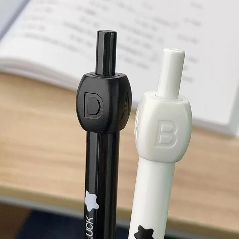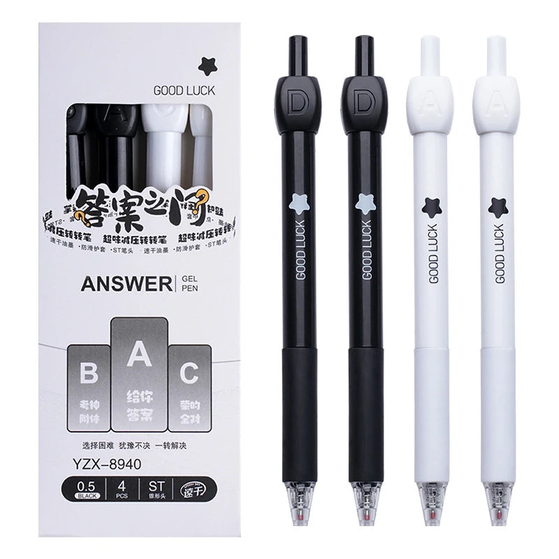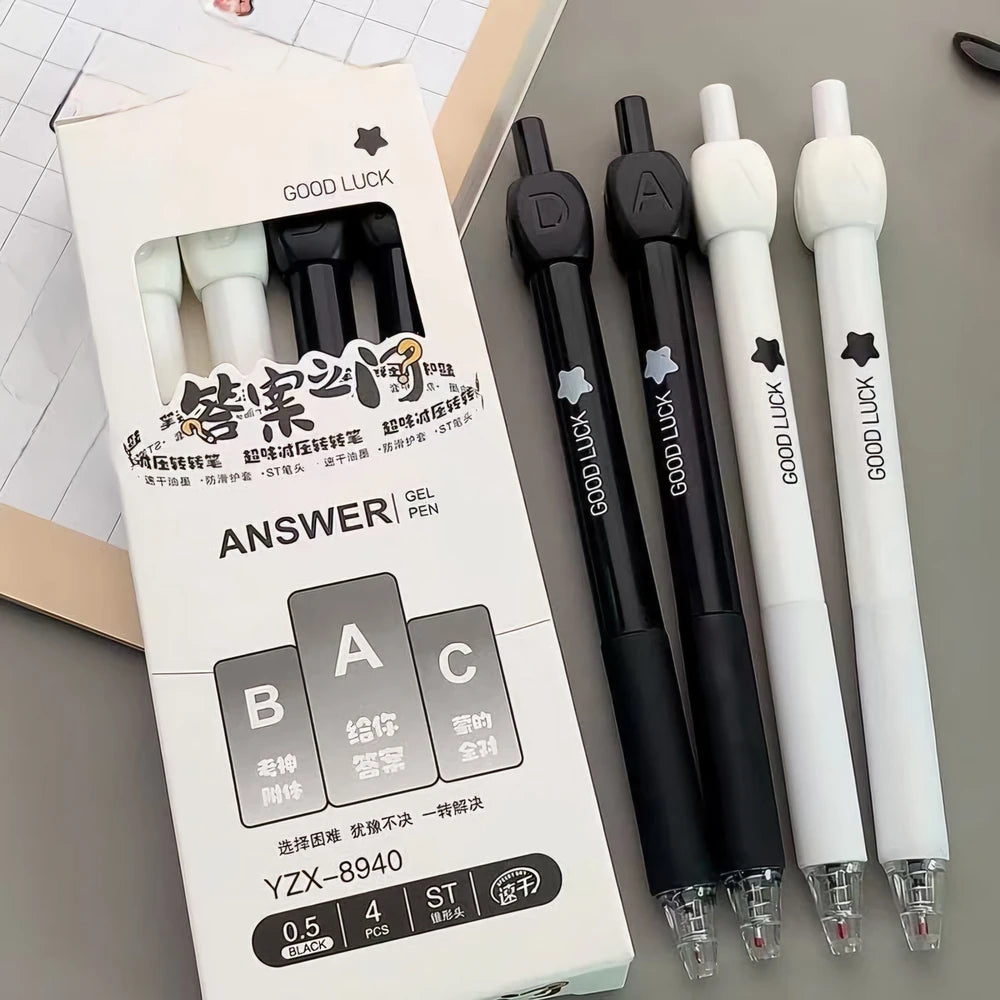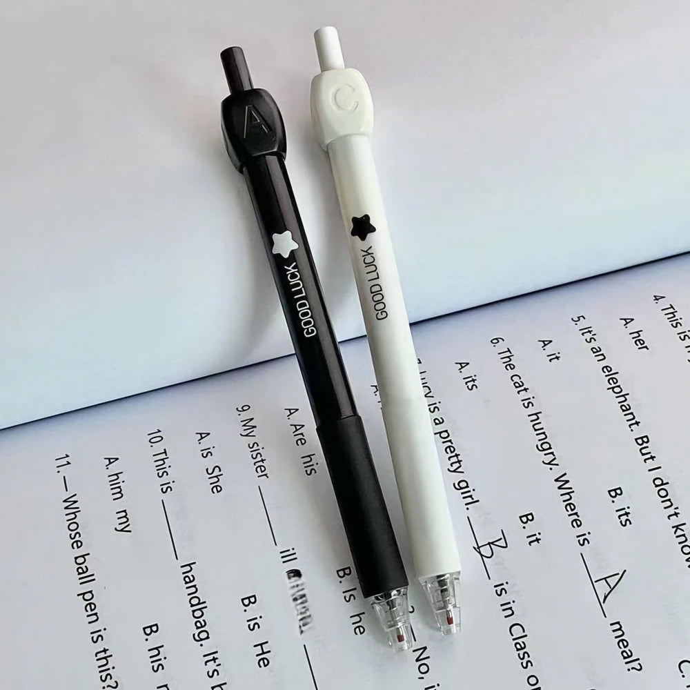Divertite con este set de 4 bolígrafos retráctiles GOOD LUCK, cada uno de aproximadamente 14 cm y con tinta negra. Perfectos para tu cartuchera, su diseño retráctil evita que se rayen tus cosas por accidente. Además, vienen en dos estilos diferentes para que elijas el que más te guste y escribas con onda en todas tus notas. ¡Ideal para sumar color y diversión a tu día!