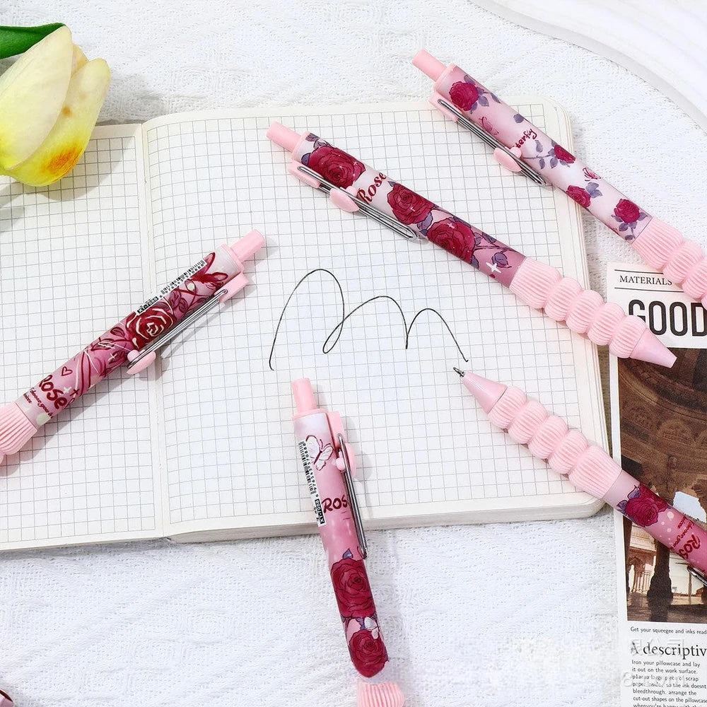Este set incluye 5 biromes retráctiles en color rosa, decorados con un encantador diseño de flores y mariposas. Cada birome, de 14 cm aproximadamente, está fabricada en ABS y cuenta con un práctico gancho para colgarla donde quieras. La tinta negra asegura una escritura clara y divertida para tus notas diarias. ¡Dale un toque alegre a tu escritorio con este set lleno de estilo!